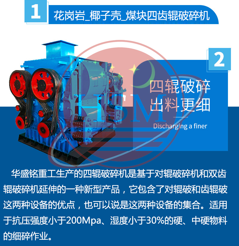 【產品價格】: 電議/面議???【生產能力】: 2-500t/小時 【進料粒度】:?≤90mm???【出料粒度】:??≤0.1-50mm? 【應用范圍】: ?四輥破碎機適用于抗壓強度小于200Mpa、濕度小于30%的硬、中硬物料的細碎作業。如焦炭、煤、陶瓷原料、石英石、石灰石、長石、水渣、石膏、粘土等固體物料。? 【產品介紹】: ?華盛銘重工生產的四輥破碎機是基于對輥破碎機和雙齒輥破碎機延伸的一種新型產品,它包含了對輥破和齒輥破這兩種設備的優點,也可以說是這兩種設備的集合。本機器具有使用維修費特低、破碎比大、性能可靠、粉塵少、噪音低等特點。